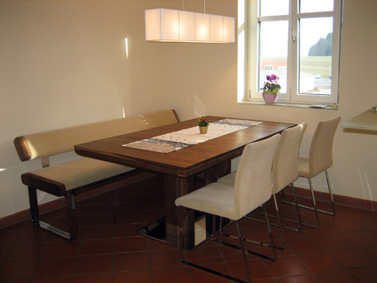 Sitzbänken werden ebenso auf Maß gefertigt und es gibt sie in vielen Variationen: mit / ohne Lehne, voll oder teilweise gepolstert, als Eckbank, mit Holz- oder Metallgestell oder auf Kufen.